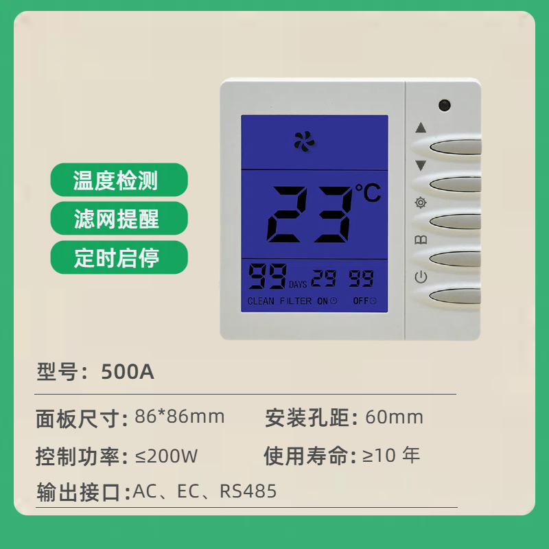 采用高精度温湿度传感器,可实时监测室内温度。采用按键技术,操作方便灵活。控制器输出信号直接控制新风机的启动及转速